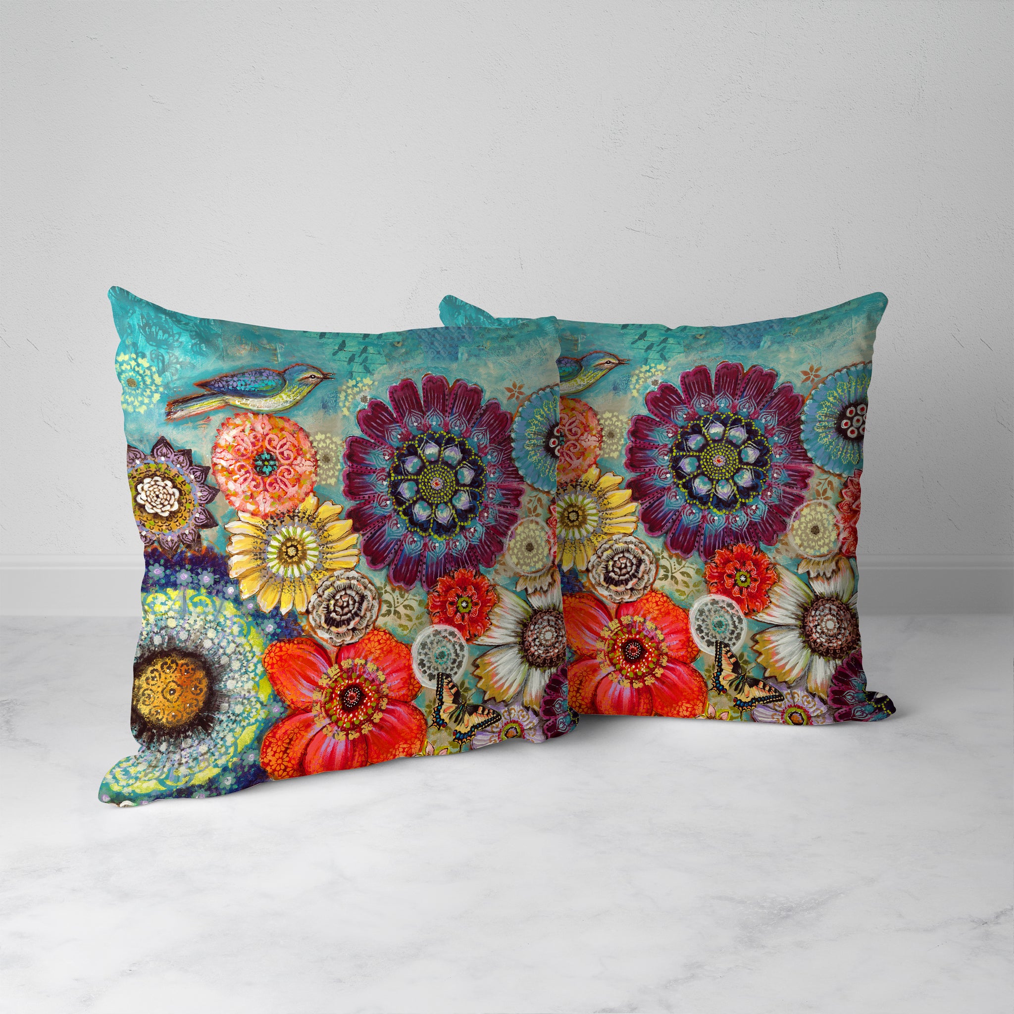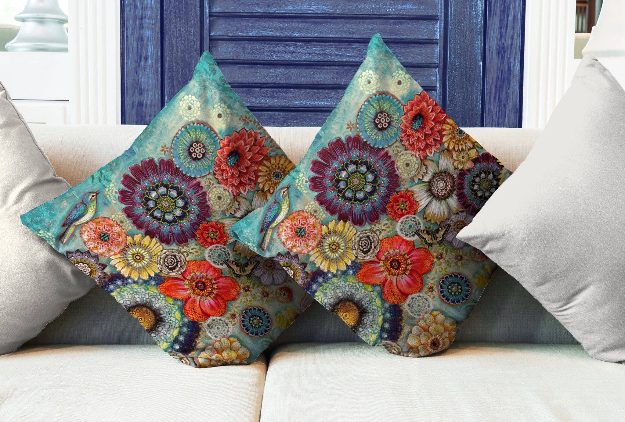 The "Blue Bird Boho Decorative Pillow" features original artwork, hand painted on canvas. Detailed flowers,...